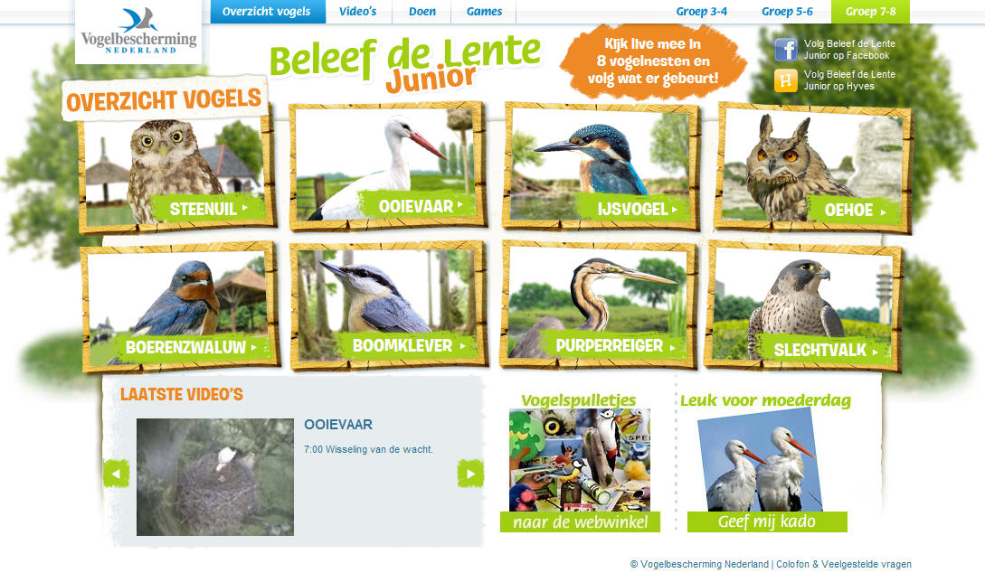 Zo na een paar heerlijke paasdagen is het niet makkelijk om weer aan je werk te beginnen. Ik vermoed dat niet alleen menig volwassene maar ook een heleboel leerlingen daar moeite mee zullen hebben. Daarom vandaag aandacht voor een site waarmee je buiten een beetje naar binnen kunt halen: Beleef de Lente.Beleef de Lente is de website van De Vogelbescherming, gemaakt door IJsfontein. Of liever gezegd: zijn de websites. Er zijn namelijk twee versies van deze website: een juniorversie en een versie voor volwassenen of oudere kinderen. Beide sites draaien om het volgen van een achttal vogels door middel van een webcam in hun nest:
