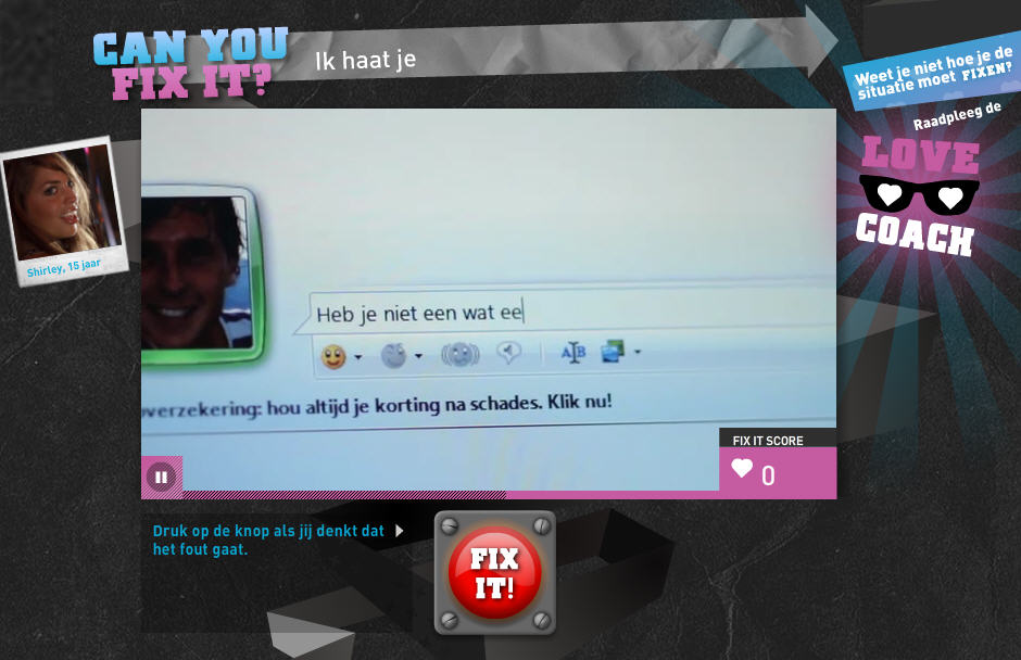 De serie games Can You Fix It bestaat uit 10 filmpjes. Bij de meeste filmpjes kan je zelf kiezen welke rol je wilt spelen: die van het jongen of het meisje of vriend of vriendin. De filmpjes duren maar een paar minuten, maar leveren genoeg gespreksstof om er een lesuur (of meer) mee te vullen. Je kunt ze gebruiken als introductie op of als voorbeeld bij op een onderwerp of vak (seksuele voorlichting, veilig internet).